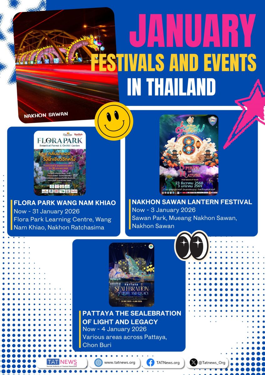2026 年 1 月以一系列遍布全泰國的文化與創意活動迎接新年到來。亮點包括象徵光明、信仰與傳統的「那空沙旺燈籠節」;以藝術裝置與表演點亮城市的「芭達雅:光與傳承的慶典」;以及展現沉浸式光影景觀的「巴蜀光影展 2026」。美食愛好者可參與「Chuan Chim 主廚巡迴」,享受精緻的美食體驗,而音樂與創意產業則於「Bangkok Music City 2026」齊聚一堂。這些活動共同為新的一年揭開富有意義與啟發性的序幕。