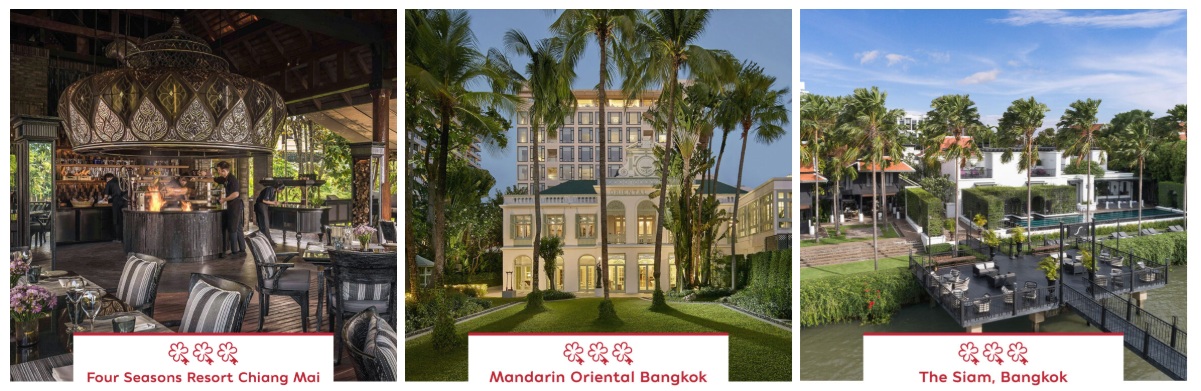 The Sukhothai Bangkok、The Okura Prestige Bangkok、Capella Bangkok、Park Hyatt Bangkok、Four Seasons Hotel Bangkok at Chao Phraya River、Rosewood Bangkok、The Peninsula Bangkok,以及新入榜的 Aman Nai Lert Bangkok。