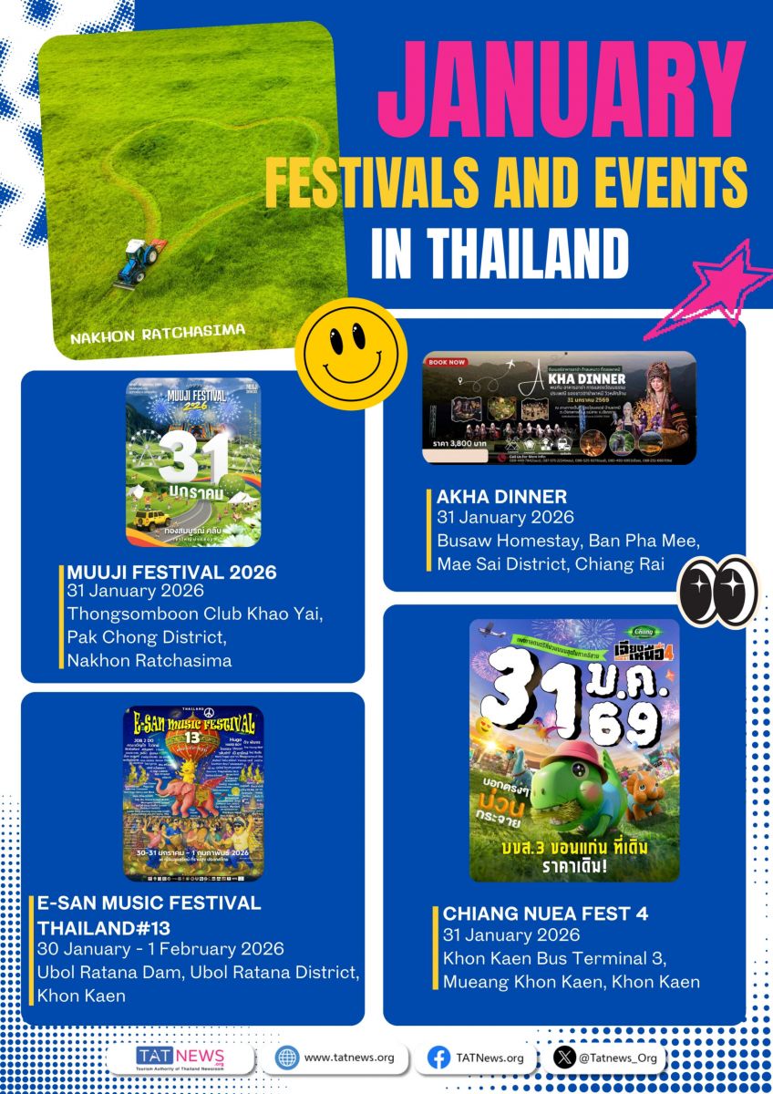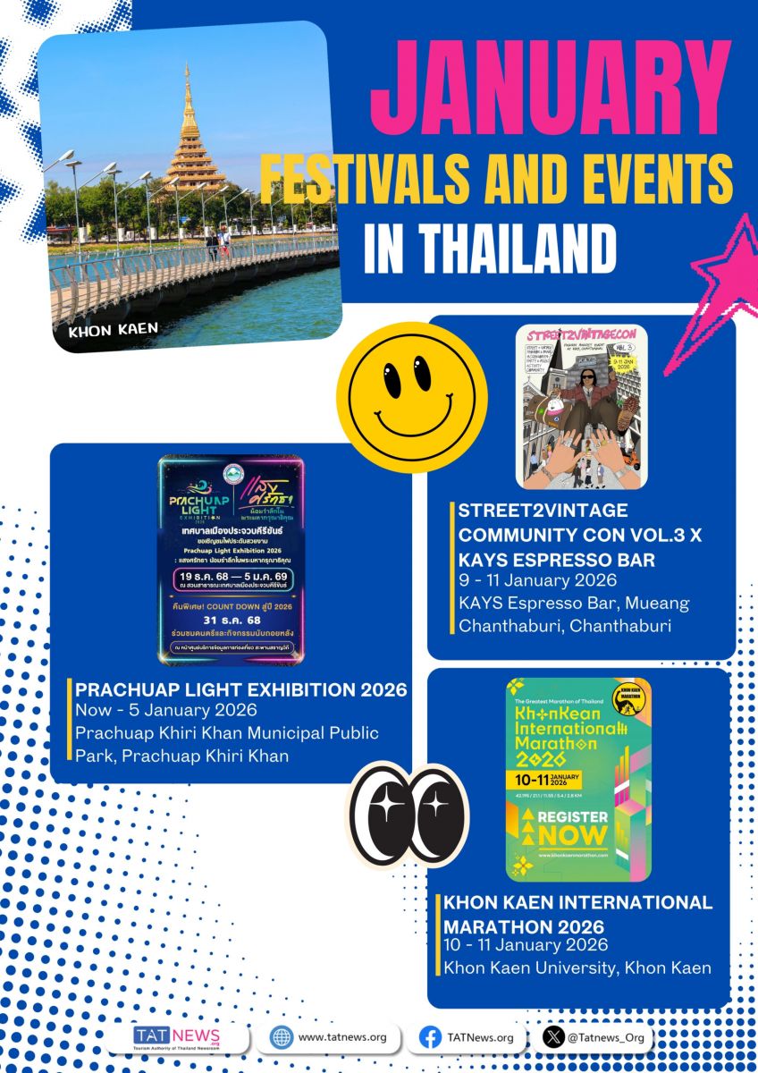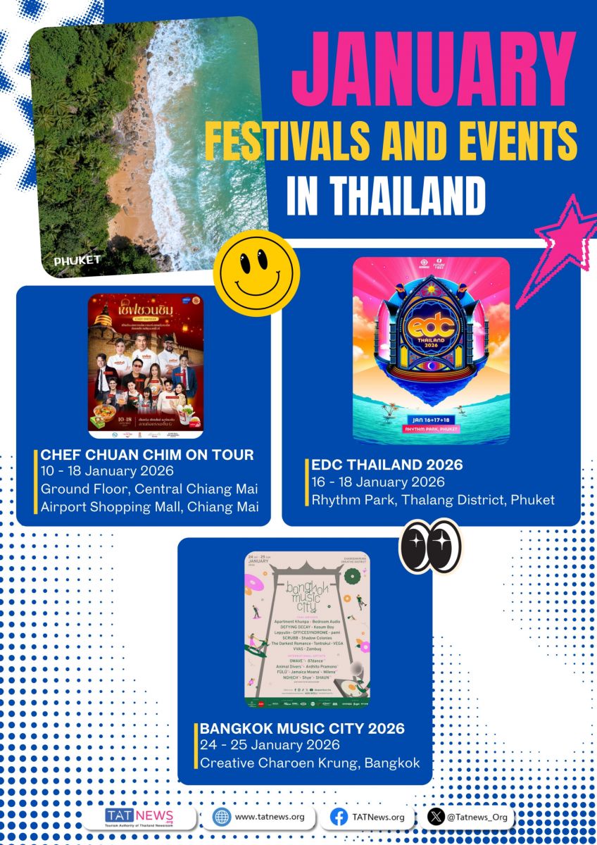 2026 年 1 月以一系列遍布全泰國的文化與創意活動迎接新年到來。亮點包括象徵光明、信仰與傳統的「那空沙旺燈籠節」;以藝術裝置與表演點亮城市的「芭達雅:光與傳承的慶典」;以及展現沉浸式光影景觀的「巴蜀光影展 2026」。美食愛好者可參與「Chuan Chim 主廚巡迴」,享受精緻的美食體驗,而音樂與創意產業則於「Bangkok Music City 2026」齊聚一堂。這些活動共同為新的一年揭開富有意義與啟發性的序幕。