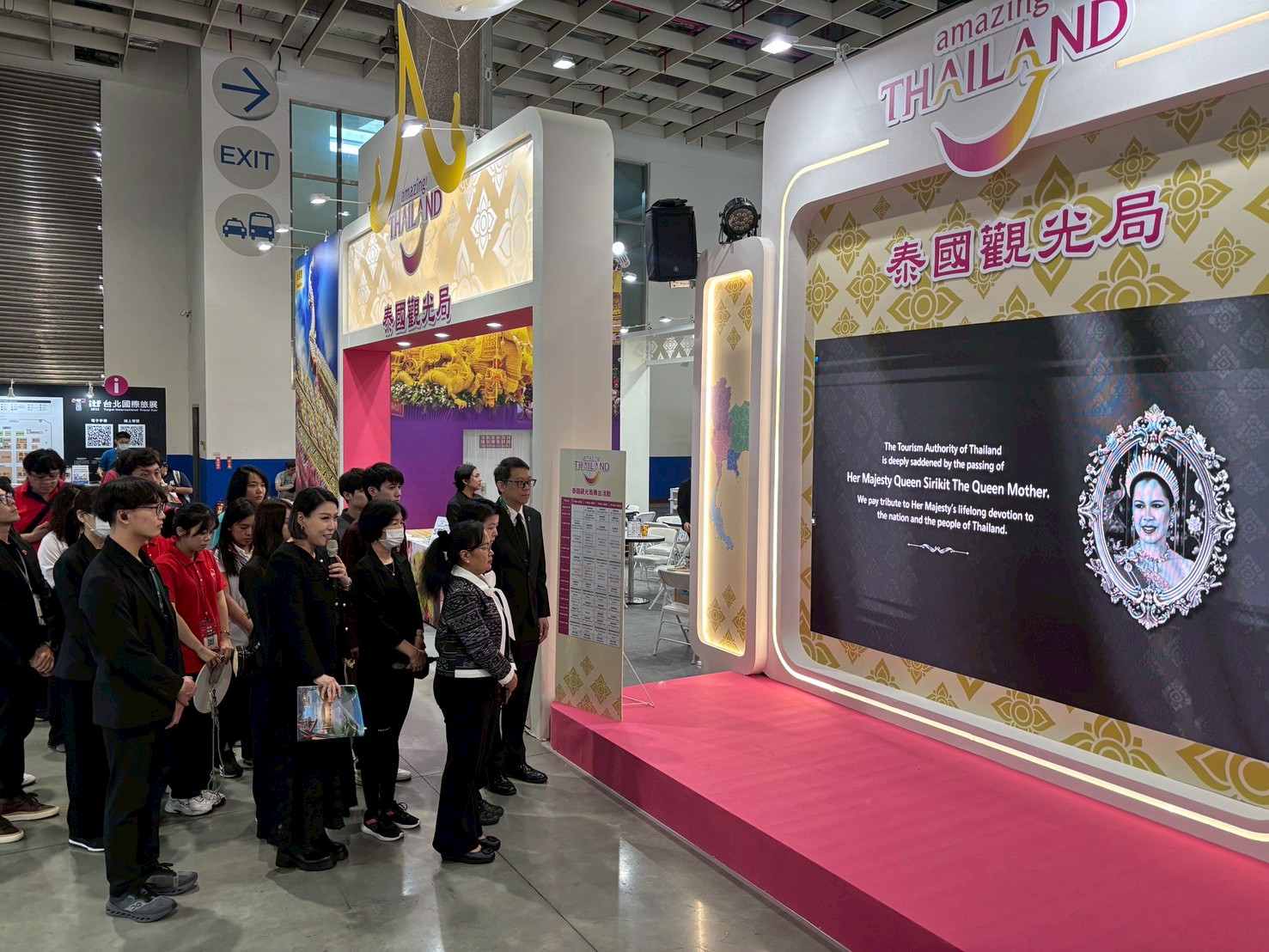 在開幕儀式上,泰國觀光局台北辦事處處長 莎莉蔓(Ms. Sarima Chindamat),偕同 泰國貿易經濟辦事處副代表蘇瑾煜(Mr. Suchin Yook) 及泰國觀光局東亞區副處長 Mr. Krida Srisomwong,共同於展館現場舉行莊重儀式,向日前辭世的泰國王太后致上最深切的哀悼與敬意。