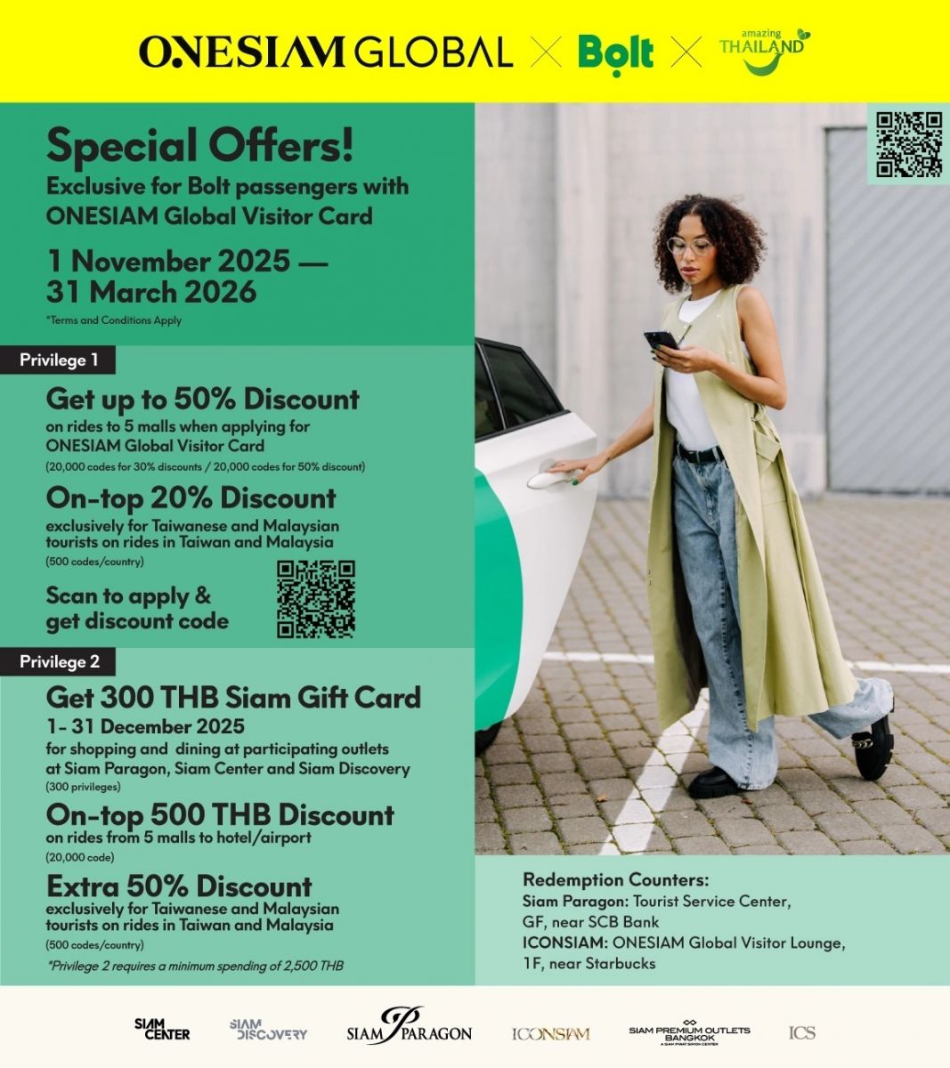 曼谷—為讓旅客在曼谷擁有更豐富、更便捷的旅遊體驗,即日起,Bolt 乘客可申請 ONESIAM Global Visitor Card,享受專為國際旅客打造的獨家優惠。此卡匯集曼谷最精彩的購物與生活體驗,是旅客不可或缺的尊享卡片。持卡人可於指定合作品牌享有高達 80% 的優惠;同時,更可享受 Bolt 乘車前往 Siam Paragon、Siam Center、Siam Discovery、ICONSIAM 與 ICS 高達 50% 的乘車折扣,讓旅客以最輕鬆的方式抵達曼谷最具魅力的地區。